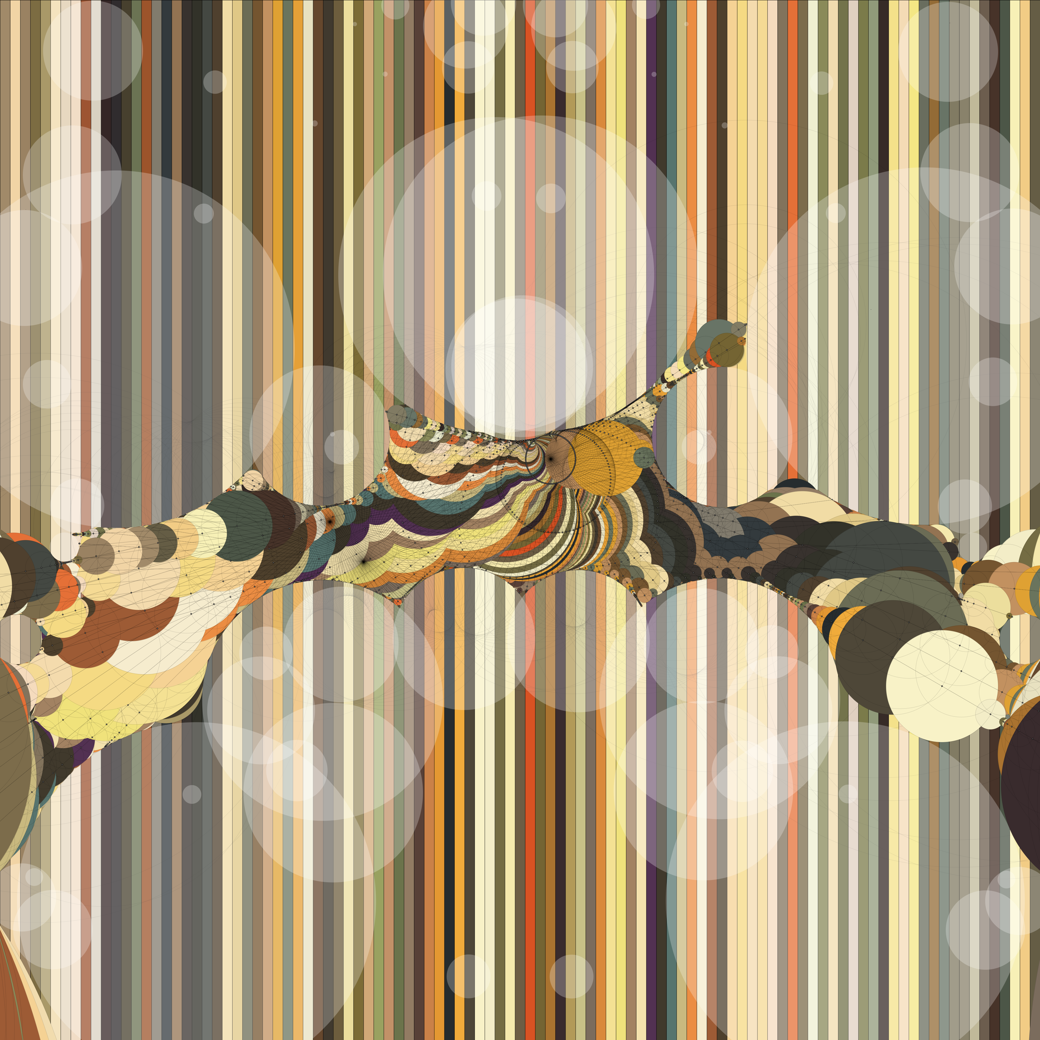 The generative digital works in the series consist of two styles: black with white lines delineating clusters of circles, and similar compositions made with an array of black lines and stripes in muted colors. Over the course of a year, the dark works were released during new moon phases, while the colorful ones were released in sync with the full moon. The lines and circles are made through a mathematical process called ray marching, where lines are divided into smaller segments and functions are applied at the points of division. Here, the segments define the forms of otherwise invisible spheres where they intersect.